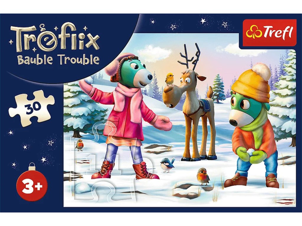 Sada puzzle se skládá z30 dílků a umožňuje sestavit výjimečně barevný obrázek znázorňující Trefly při hře na sněhu.