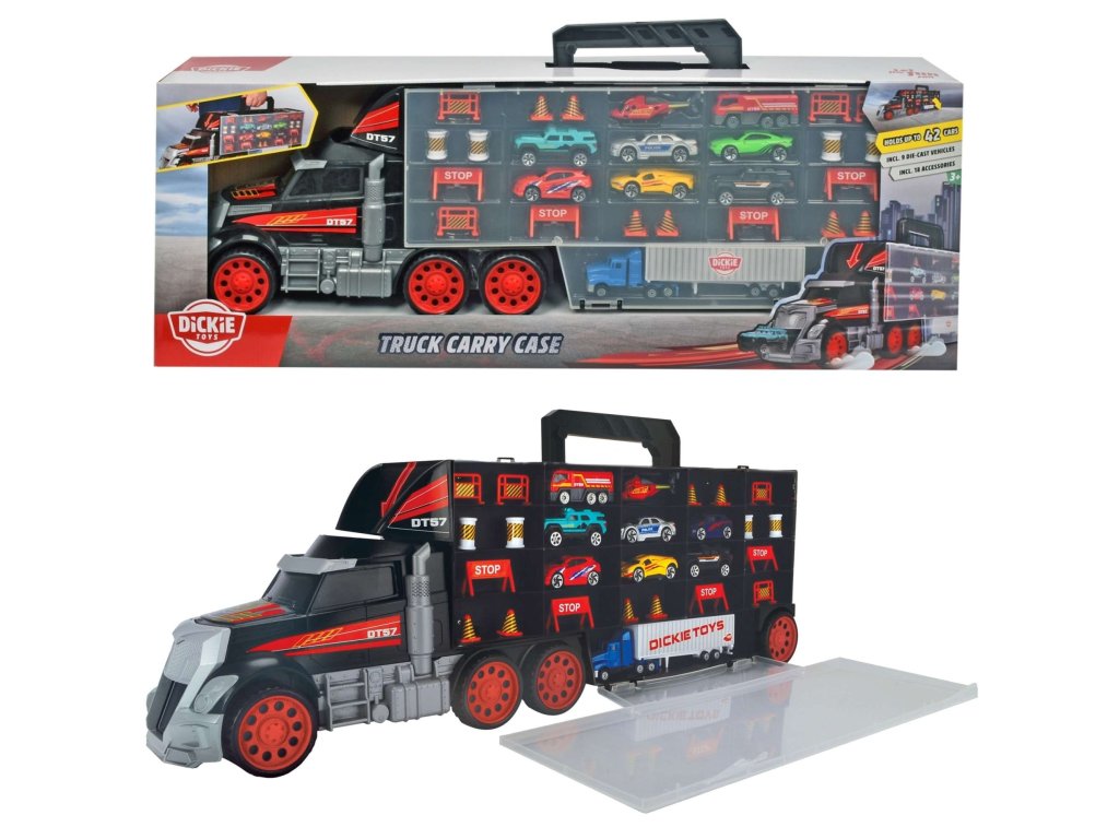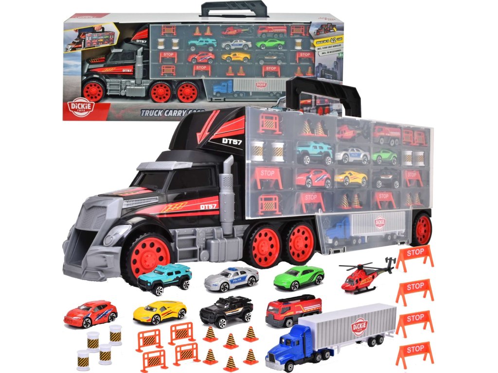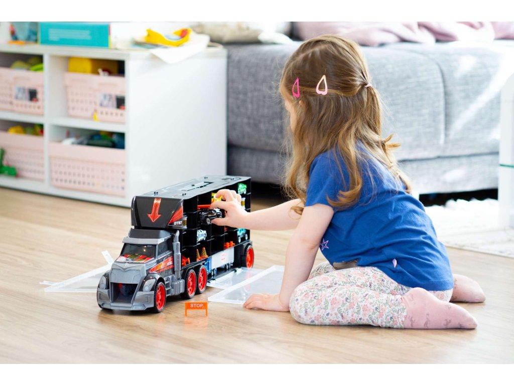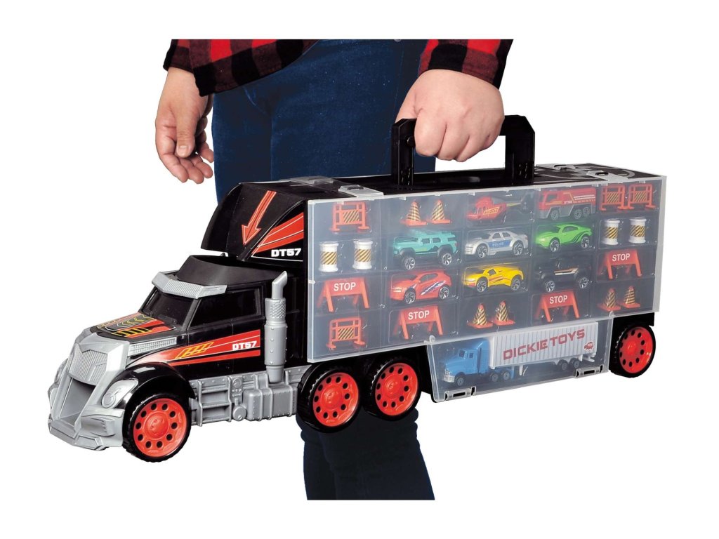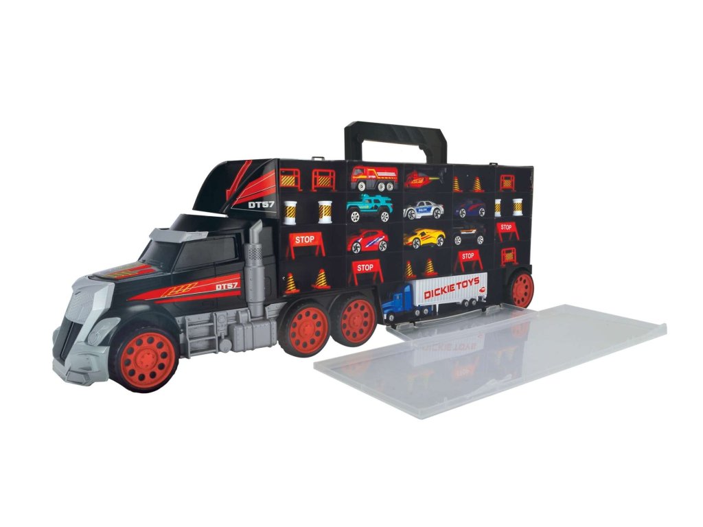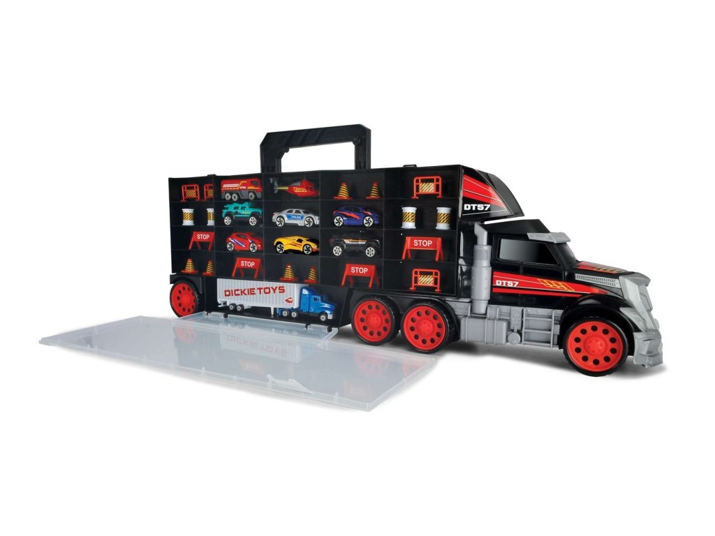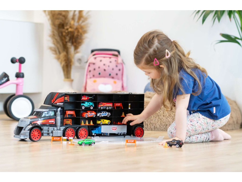 Nákladní auto,je neobvyklý nápad na dárek pro každého malého milovníka automobilů.Transporter je černý s červenou a šedé prvky, má pohyblivá kolečka, umožňující pohyb po rovném povrchu a systém bočního otevírání,< span > což usnadňuje nastupování a vystupování aut. Transportér pojme až 42 aut, a samotné přihrádky jsou dokonale přizpůsobeny potřebám. Jeho délka je cca 63 cm. Sada obsahuje 18 doplňků, jako je helikoptéra, nákladní auto, auta a silniční doplňky >.
