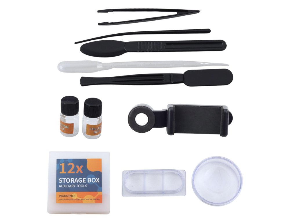 Sada obsahuje také speciální držák na telefon, který vám umožní upevnit váš smartphone nad okulár mikroskopu - to vám umožní fotit přípravy a sdílet pozorování s ostatními. Další příslušenství – včetně pinzety, sklíček, vzorků a laboratorních nástrojů – zajistí, že budete plně připraveni na své první experimenty.