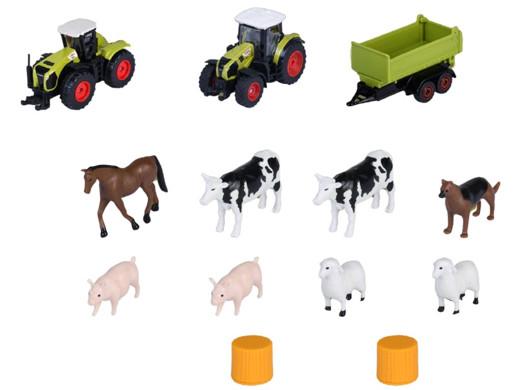 Sada obsahuje dva tahače Claas (měřítko 1:64) a přívěs, který může "pracovat" na farmě - například převážet zvířata nebo náklad.