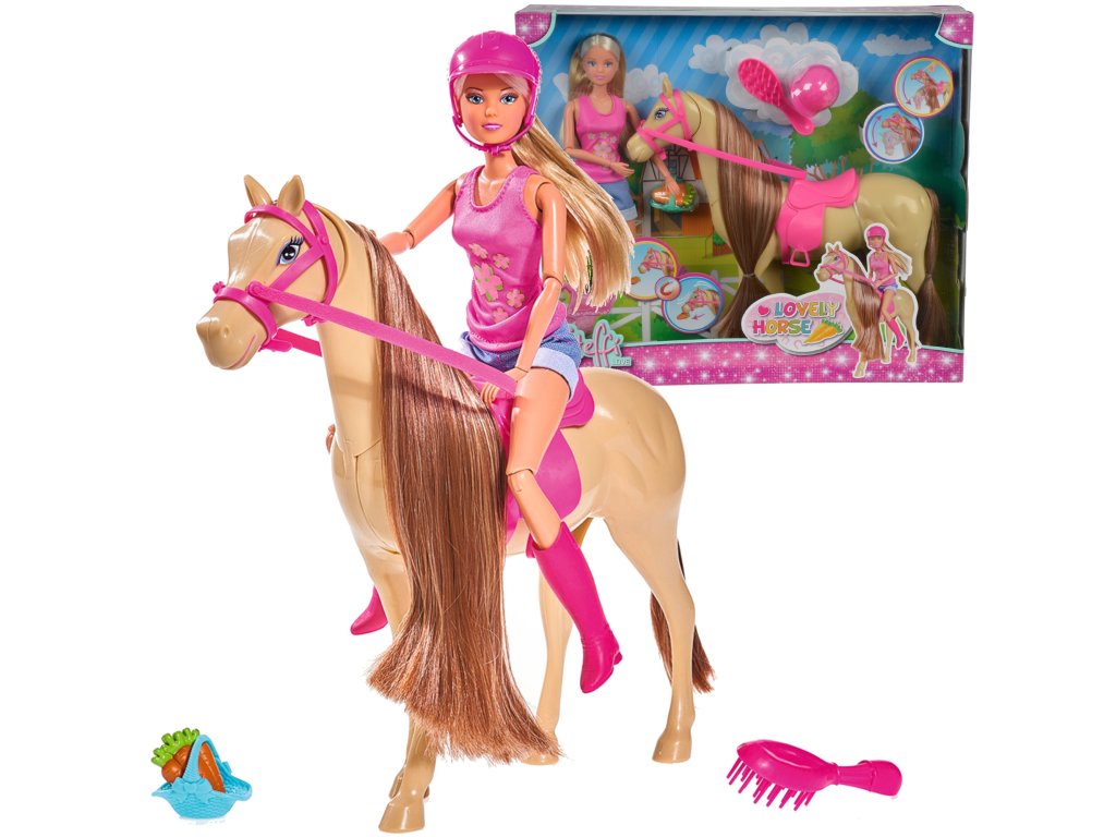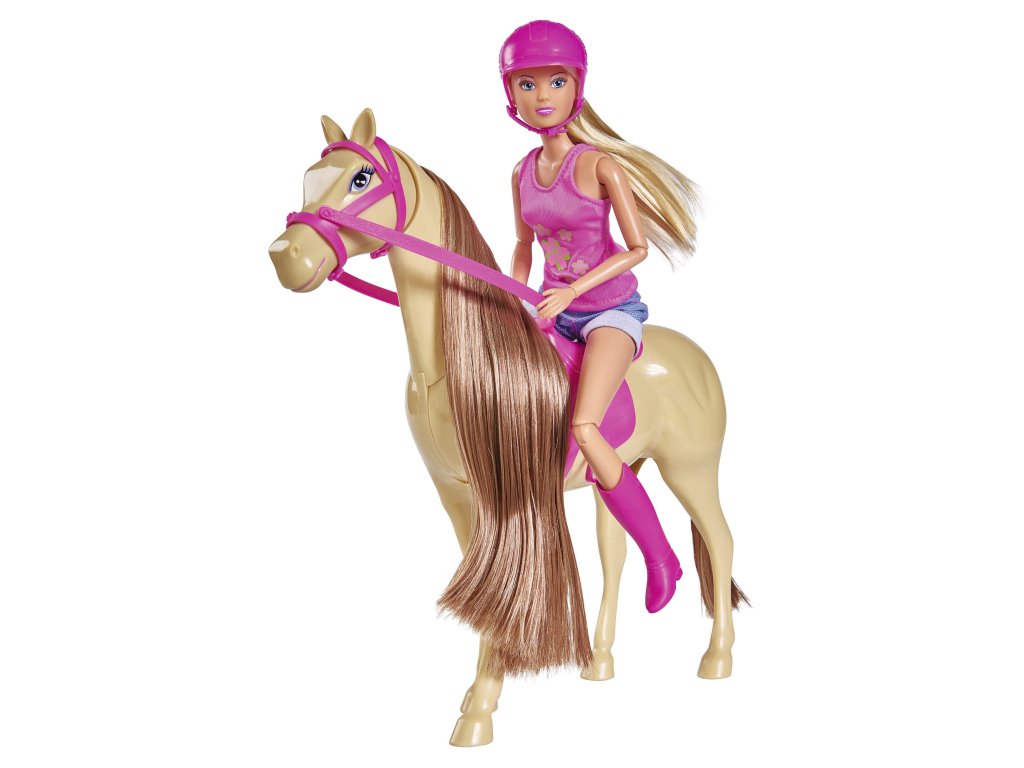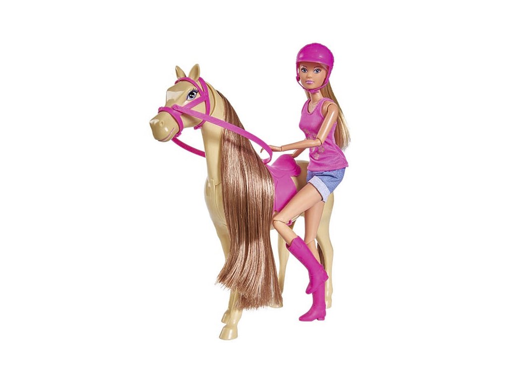 Steffi miluje jízdu na koni, a tak se tentokrát vydá na projížďku se svým milovaným koněm.huPanenka má na sobě růžovou halenku s květinami a krátké šortky. V ruce drží košík s mrkví a celý outfit zdobí dlouhé růžové jezdecké kozačky. Během hry můžete panence nasadit růžovou helmu, která je součástí sady. Dívčí kůň má dlouhou krásnou hřívu, kterou lze česat přiloženým růžovým hřebenem a růžové sedlo a otěže na hřbetě.