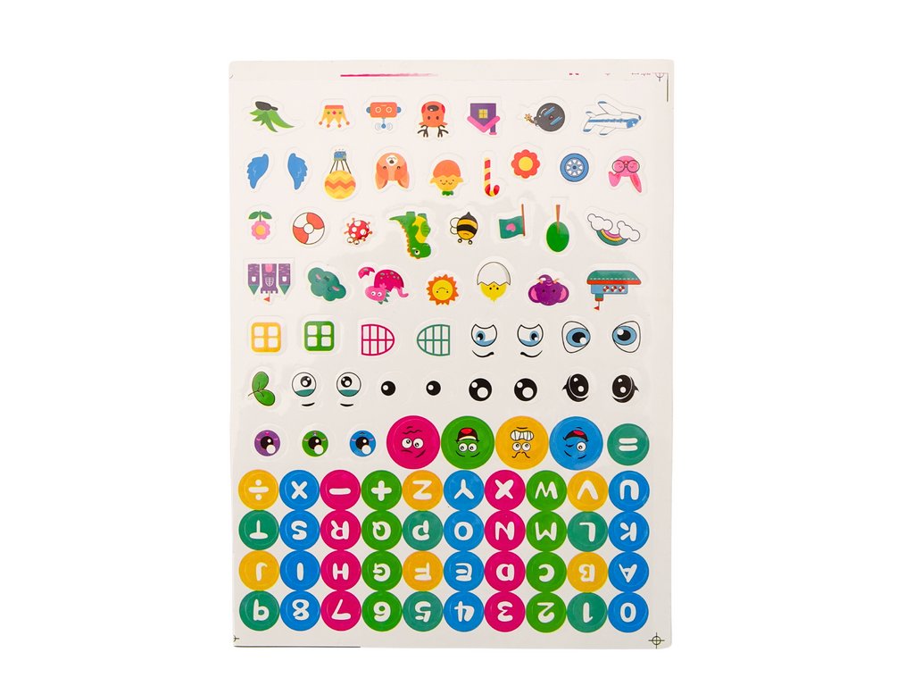 Sada navíc obsahuje samolepky s písmeny, číslicemi a různými motivy, což umožňuje další personalizaci a vytváření vlastních vzorů. Díky těmto doplňkům se děti mohou zábavnou formou učit písmena a číslice a zdobit své stavby podle vlastních představ a preferencí.