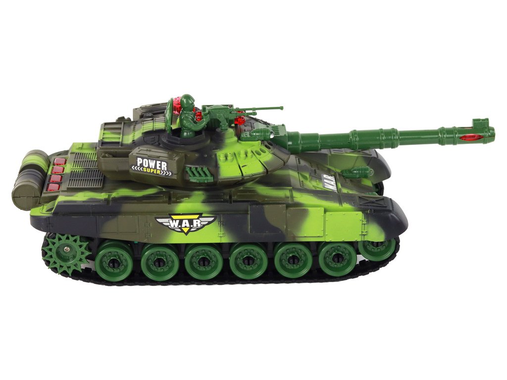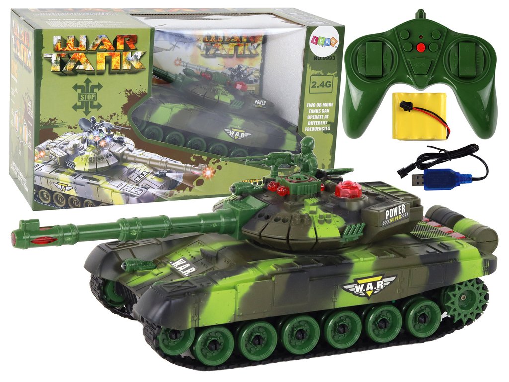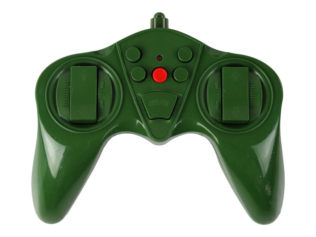 Tank má pásový pojezd na měkkých pryžových pásech, ideální pro různé povrchy. Otočná kabina umožňuje střílet jakýmkoli směrem a otevírací poklop s řidičem tanku dodává realističnost. Napájen baterií, včetně kompletní výbavy, zaručuje ekonomickou zábavu. Multifunkční dálkové ovládání umožňuje plnou kontrolu, včetně jízdy, otáčení a střelby.