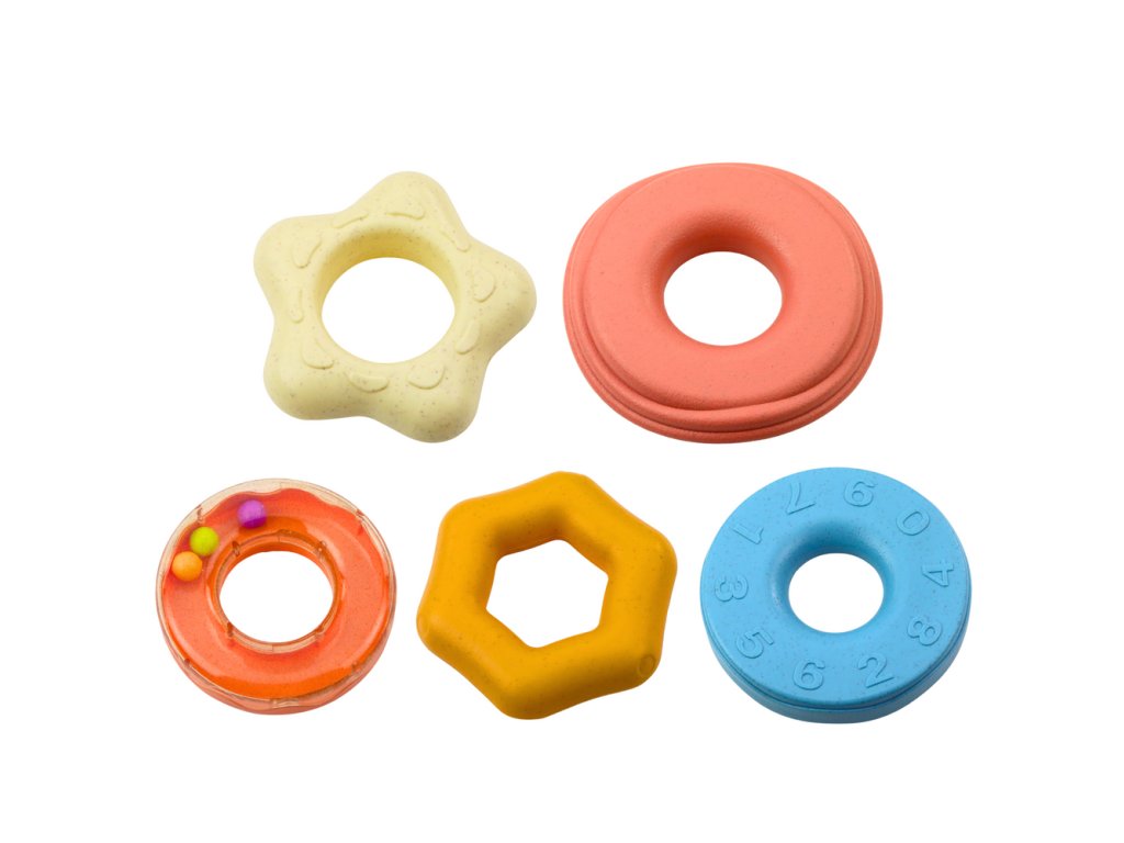 Každý z prstenů má jinou texturu a jeden z nich je navíc vybaven funkcí chrastítka. Díky tomu poskytuje hračka dítěti nejrůznější podněty – zvukové, zrakové i smyslové – podporující rozvoj vnímání a koncentrace. Všechny prvky jsou vyrobeny z bezpečného odolného materiálu, který neobsahuje škodlivé látky a je plně vhodný pro nejmenší uživatele.
