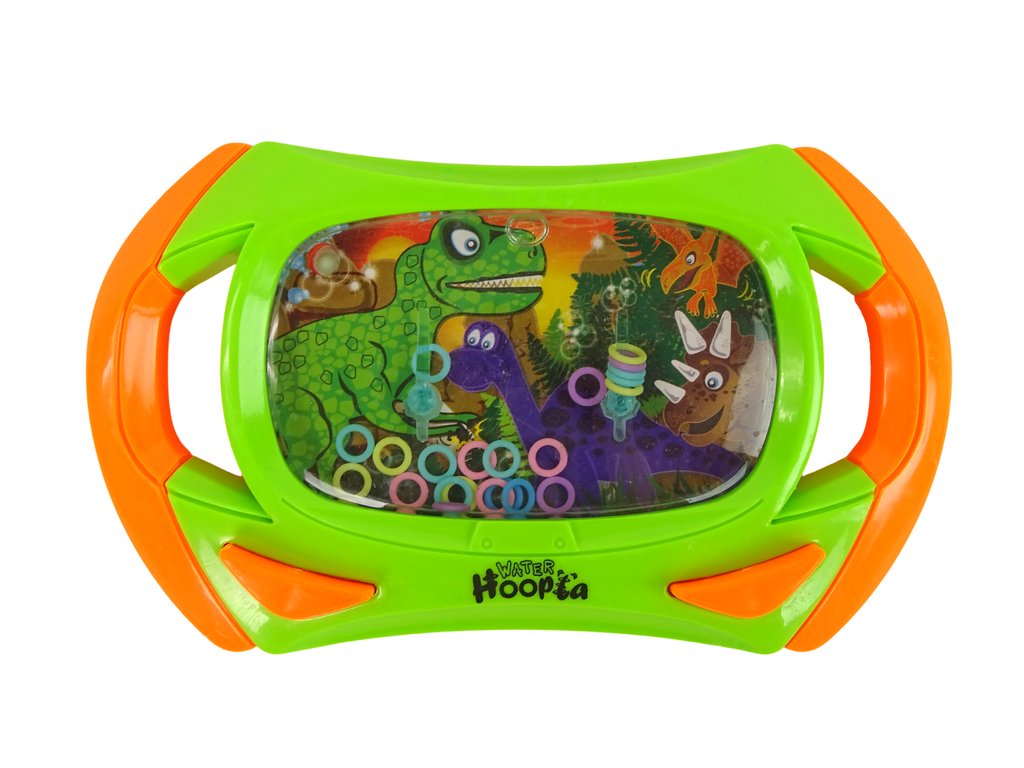 Hračka do vody má tvar konzole v zelené a oranžové barvě. Uvnitř je grafika světa dinosaurů s triceratopsem, tyranosaurem rexem atd. v pozadí.