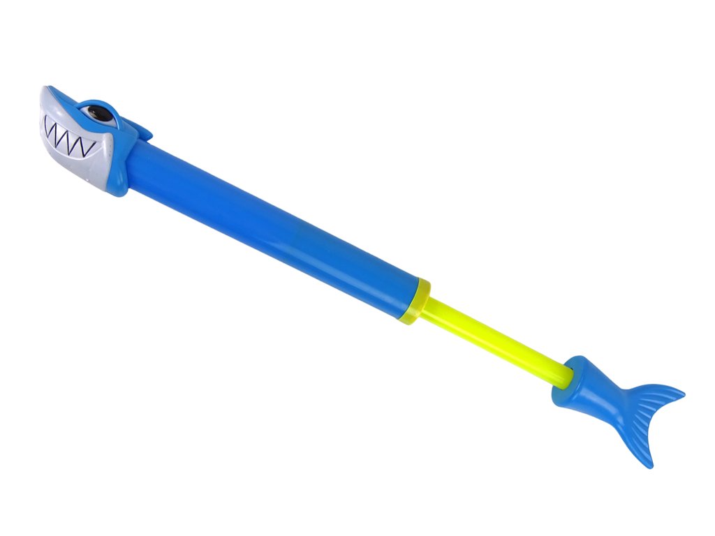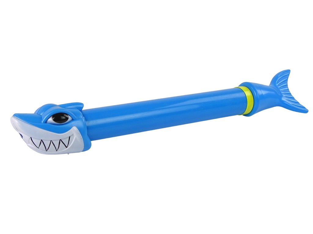 Celá hračka je vyrobena z plastu, obličej má tvar žraloka, voda z něj jen teče. Abyste dostali munici - vodu, musíte ji nejprve vysát, na dvorku stačí postavit větší kbelík s vodou, pomocí sání si voda najde cestu do sudu. Jakmile začnete pumpovat klikou ve tvaru ploutve, ze sudu vyteče proud vody.