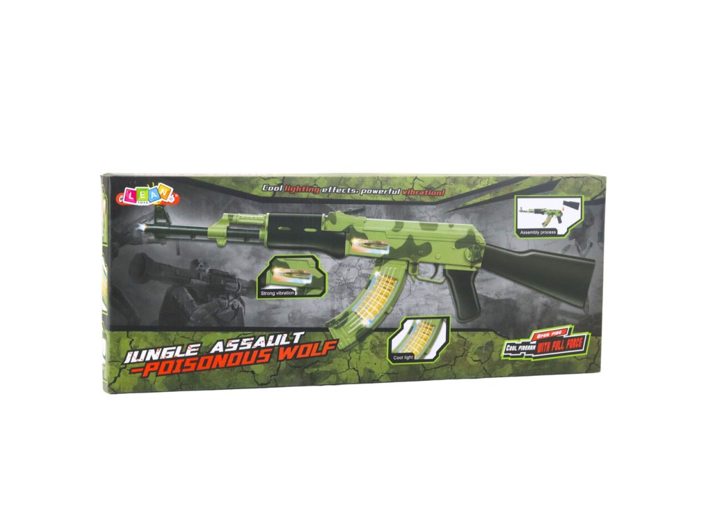 Tato realistická vojenská puška ve stylu Jungle Assault je ideální pro mladé fanoušky akce a vojenské hry. Tato hračkářská puška s maskovacími barvami a detaily připomínajícími skutečnou zbraň vyniká svým nápadným vzhledem a velkou velikostí – neuvěřitelných 70 cm na délku!