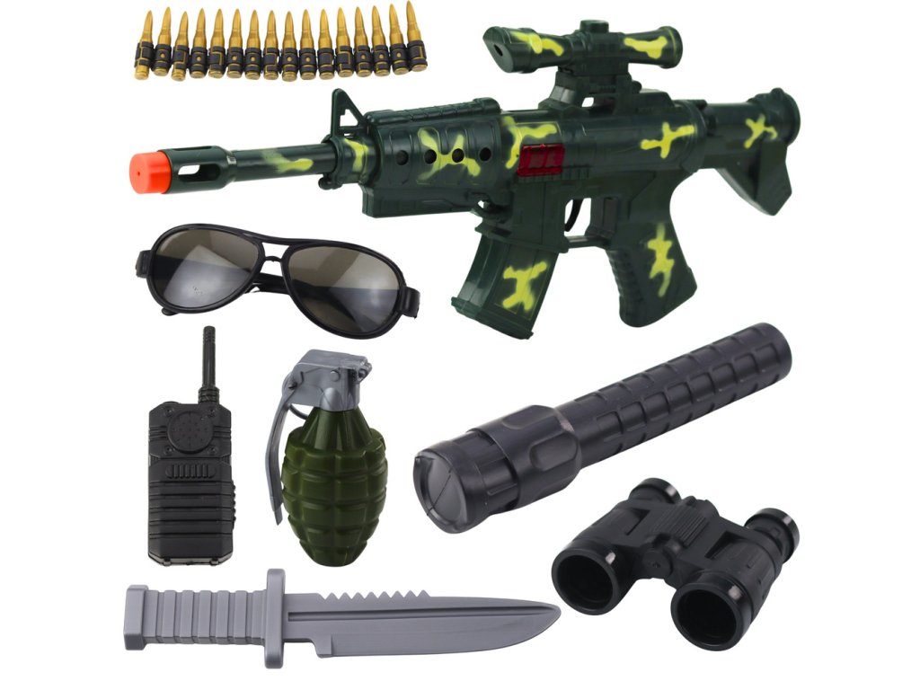 Nejdůležitější vlastností sady je mechanický zvuk střelby, který se ozve při stisknutí spouště. Tento efekt dělá hru dynamičtější a napínavější. Kromě pušky sada obsahuje také granát, nůž, dalekohled, svítilnu, vysílačku, ochranné brýle a sadu nábojů – to vše ve vojenském stylu, což dětem umožňuje vytvářet si vlastní scénáře misí a dobrodružství.