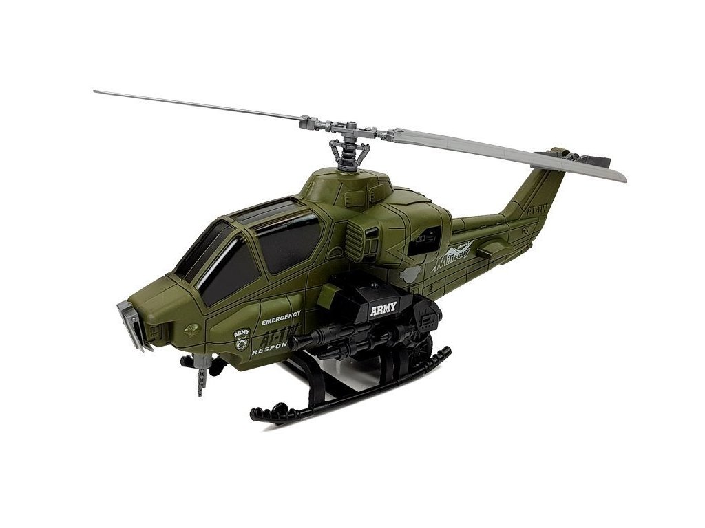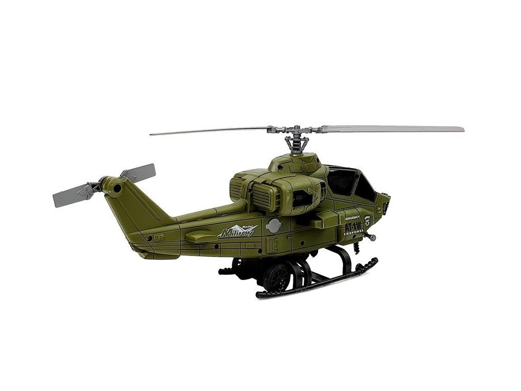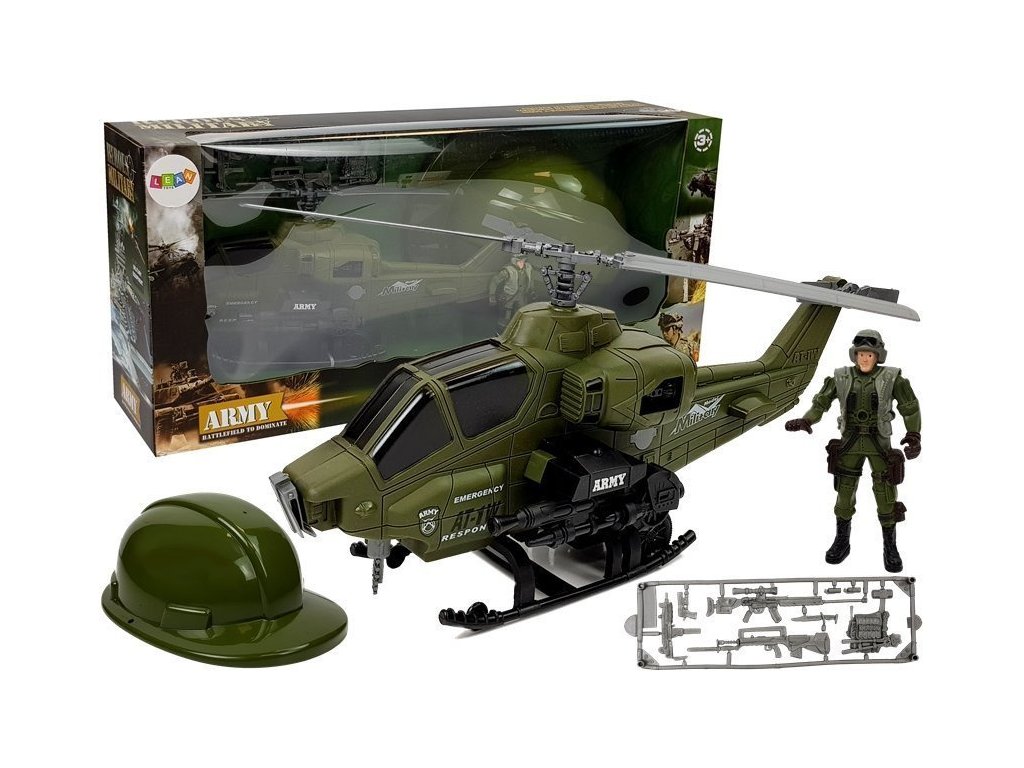 Rozměrný vrtulník má vrtule otočné o 360 stupňů, které je přirozeně pohybují ručně. Má kola namontovaná na podvozku, po zatažení stačí pustit a sledovat, jak zrychluje, vzlétá k letu. Má třecí pohon. Na boku jsou střílející děla. Figurka vojáka má pohyblivé ruce, ve kterých může držet různé plastové zbraně obsažené v sadě. Díky helmě se bude malý válečník cítit jako ve skutečné bitvě.