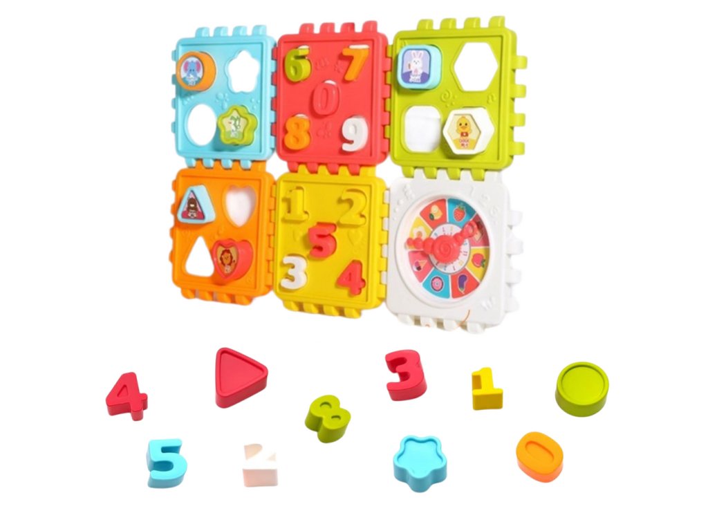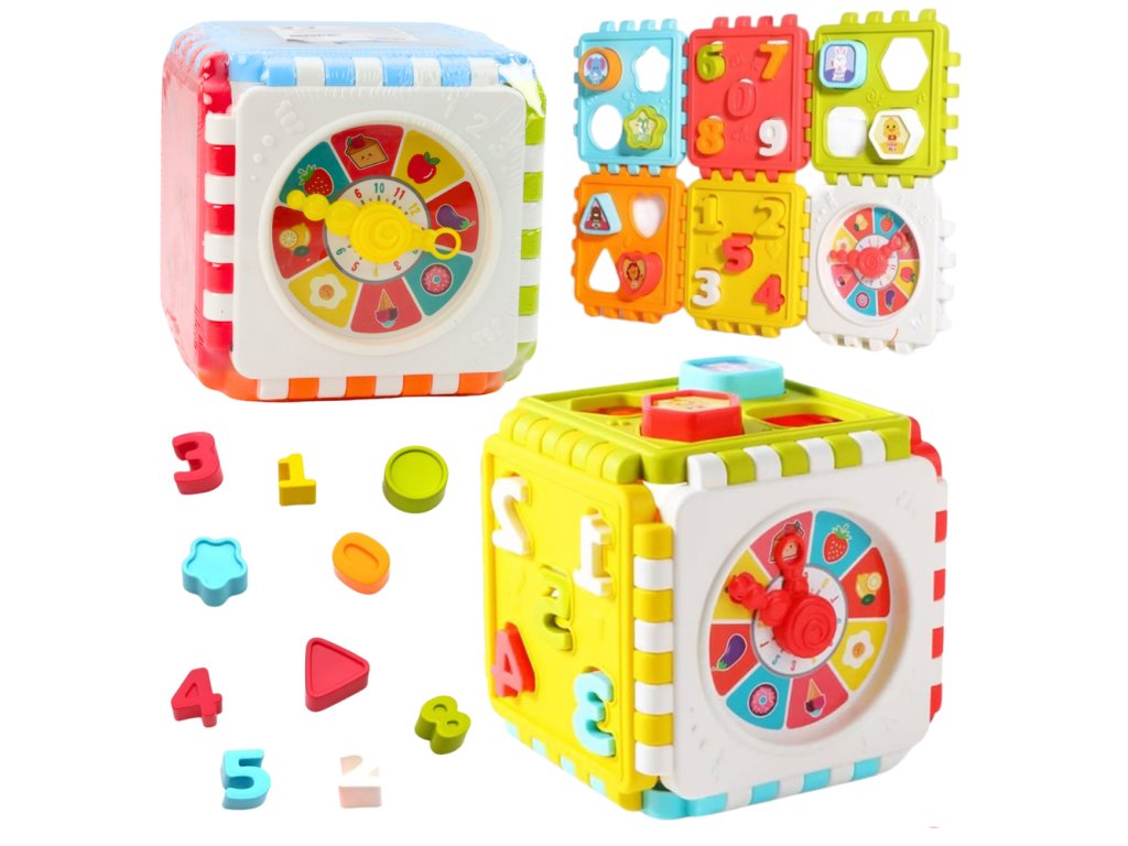 Každá ze stěn kostky má jinou činnost: hodinky s pohyblivými ručičkami, třídič tvarů a čísel, ale i grafiku a prvky stimulující smysly. Sada obsahuje odpovídající bloky v různých barvách a tvarech, které by měly být umístěny do příslušných otvorů. Všechny stěny jsou odnímatelné, což usnadňuje vyprazdňování kostky a poskytuje další příležitosti ke hře.