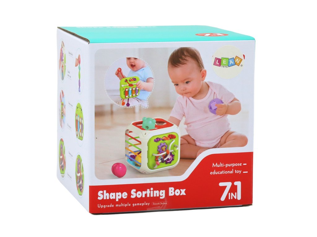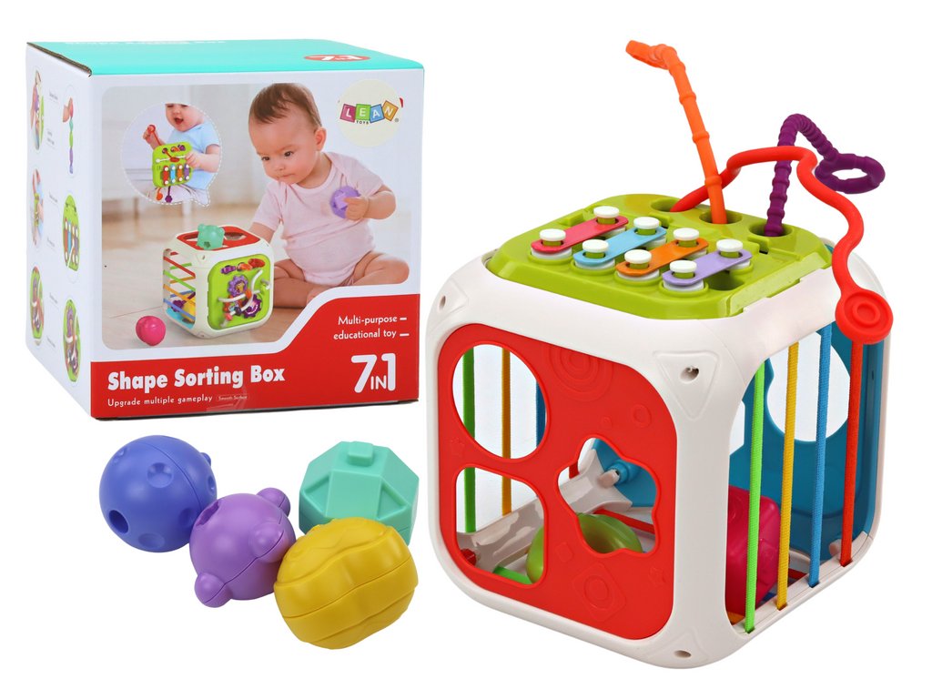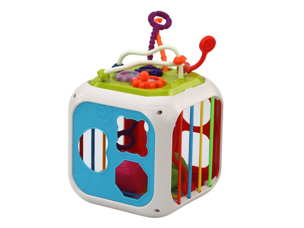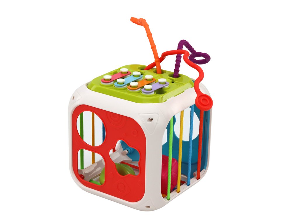 Hračka nejen zabaví, ale i naučí. Dítě si může procvičovat poznávání tvarů a barev vkládáním kostek do příslušných otvorů v třídicí kostce. Je to skvělý způsob, jak rozvíjet manuální dovednosti a motorickou koordinaci. Odnímatelná stěna kostky navíc obsahuje další atrakce, jako jsou činely, ozubená kola a propletení, což přidává prvek interaktivní hry.