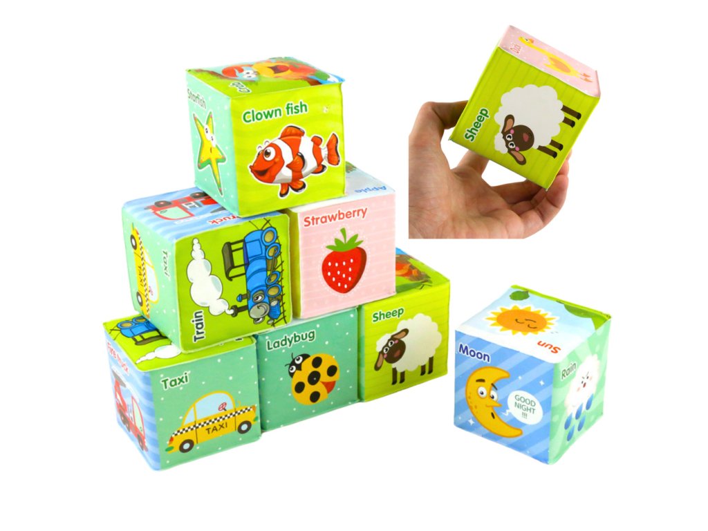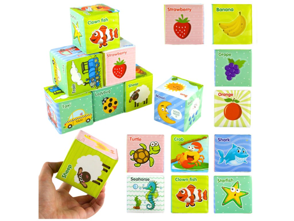 Kostky lze skládat, drtit, házet, zkoumat hmatem a pozorovat vzory a barvy, což stimuluje smysly dítěte a podporuje rozvoj jemné motoriky.