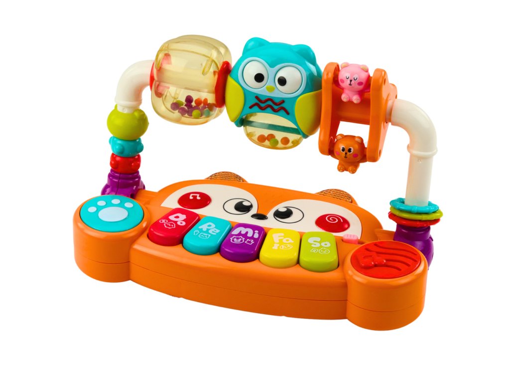 Piano je navíc vybaveno barevným barem s interaktivními hračkami, který rozšiřuje zábavu o prvky pohybu. Jeho součástí je mimo jiné rotační sovička s kuličkami uvnitř a také přívěsky na pohyb a otáčení, které podporují rozvoj jemné motoriky, koordinace ruka-oko a manuální zručnosti. Různé textury a barvy podněcují zvědavost a podporují nezávislé zkoumání.