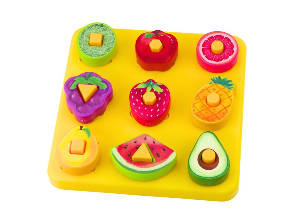 - Typ: Vzdělávací puzzle – skládání tvarů a ovoce