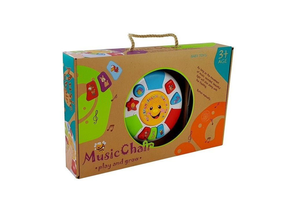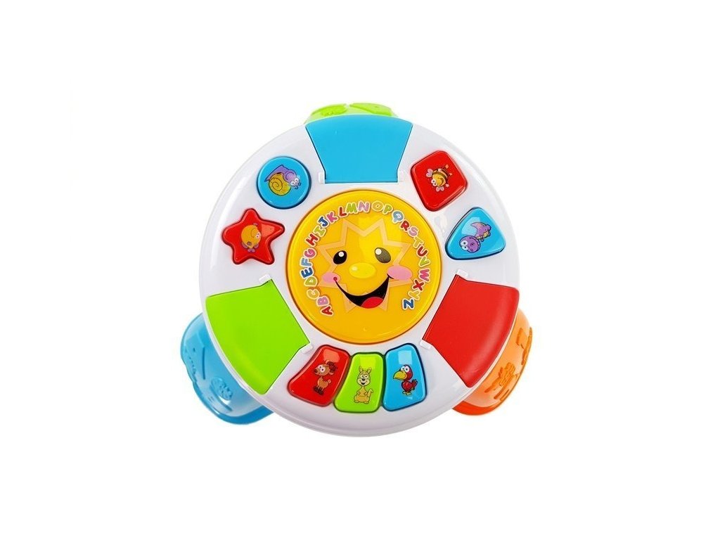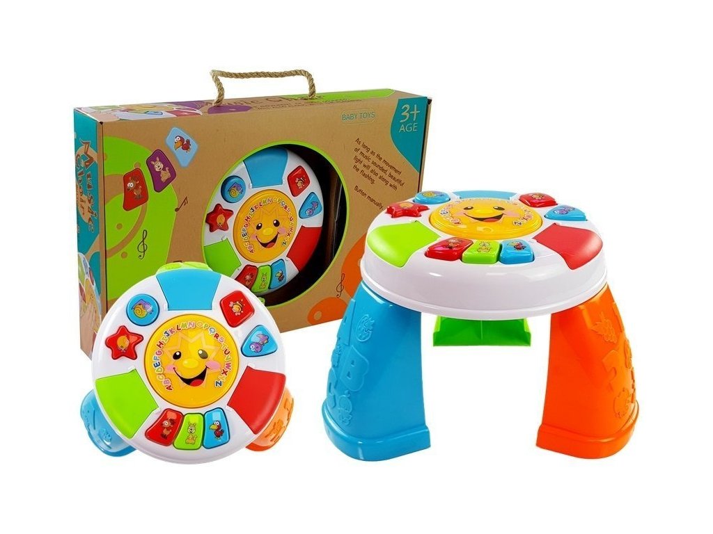 Na desce stolu jsou tlačítka ve tvaru trojúhelníku, čtverce, koleček a hvězd, které aktivují veselé zvuky. Ve střední části je velké kulaté tlačítko se sluníčkem, jehož stisknutím uslyšíte smích i zvuky a melodie bubnů. Hned na kraji máme mini piano se třemi tlačítky s mazlíčky.