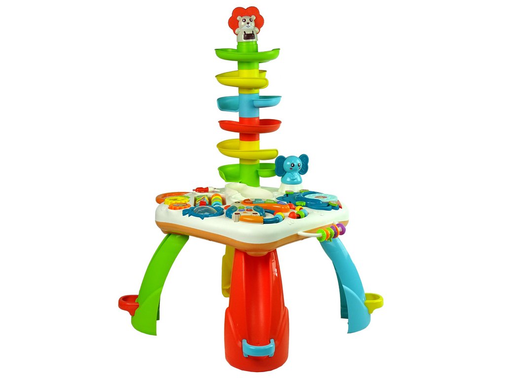 Interaktivní hračka s mnoha aktivitami je nejen nápadem na velmi zajímavou hru, ale také originálním způsobem, jak zlepšit správný vývoj batolete. Stůl kombinuje dvě hračky, výukový panel a kuličkovou skluzavku. Oku lahodící barvy budou perfektní pro chlapce i dívky.