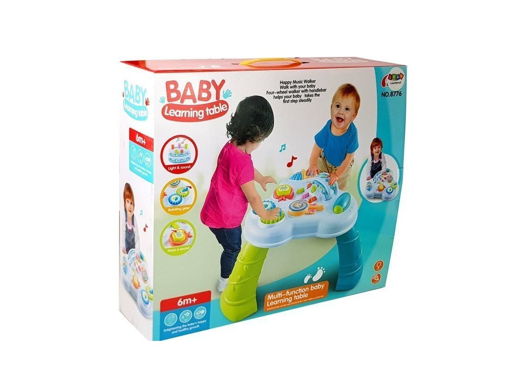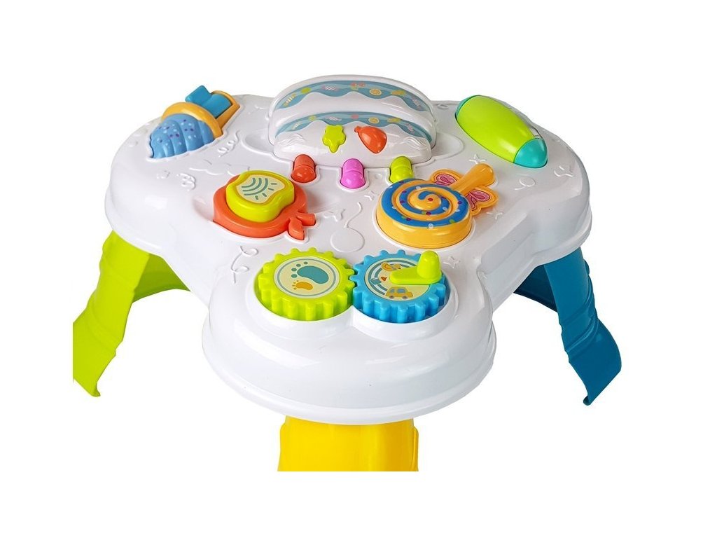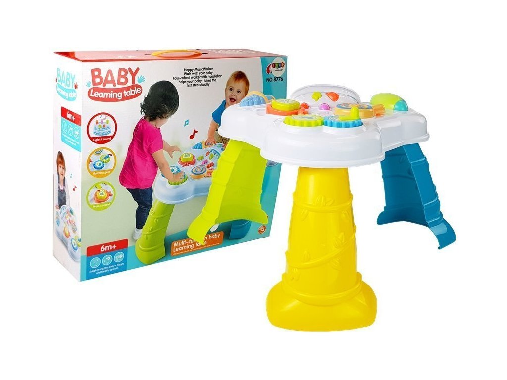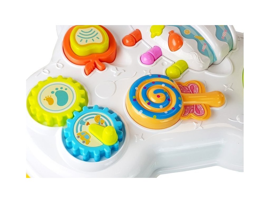 Na desce stolu jsou dvě velká ozubená kolečka, která se po otočení rukojetí dají do pohybu. Lízátko může po odpojení od stolu bezpečně sloužit jako chrastítko, jablko po odpojení od stolu jako pískátko. Na jedné straně je navíc modré chrastítko, kterým může batole otáčet, a na druhé straně je led s posuvnou západkou. Díky hračce bude dítě moci rozvíjet svou přesnost a manuální zručnost. Barevné prvky a různé tvary nejen upoutají pozornost batolete, ale naučí ho rozpoznávat barvy a struktury.