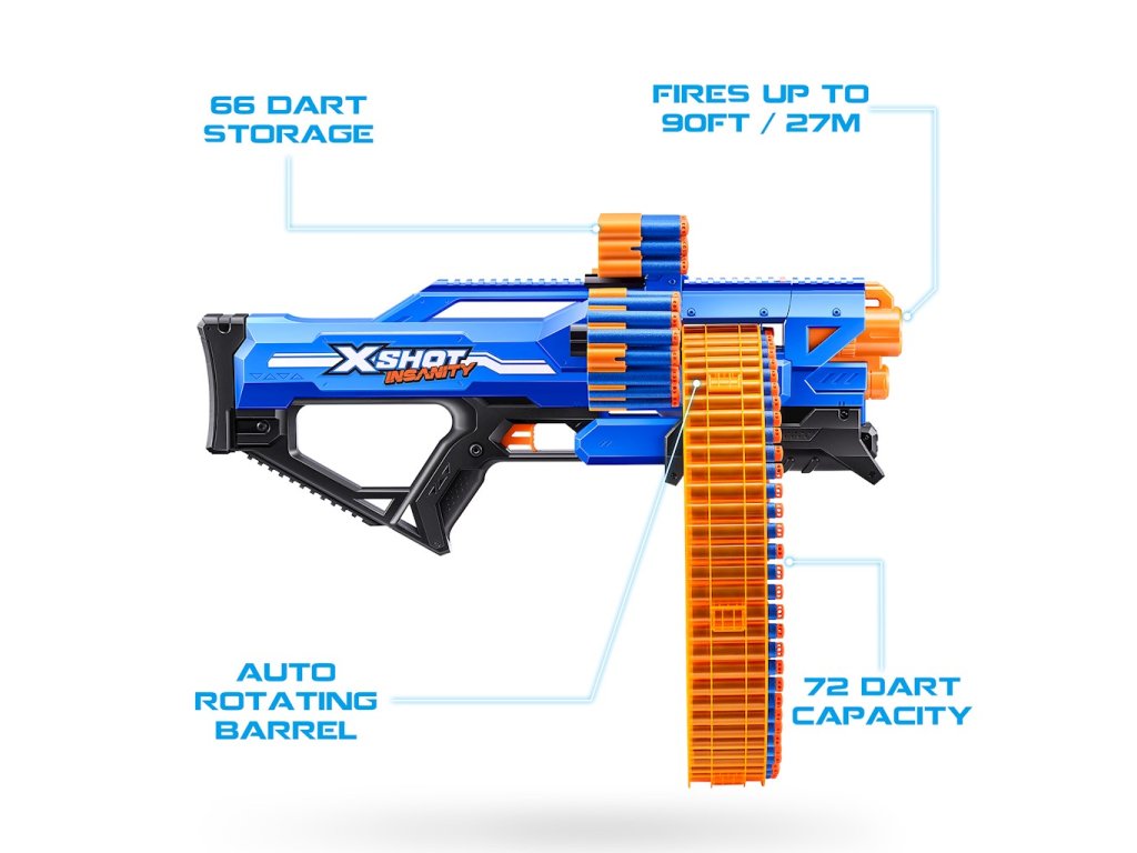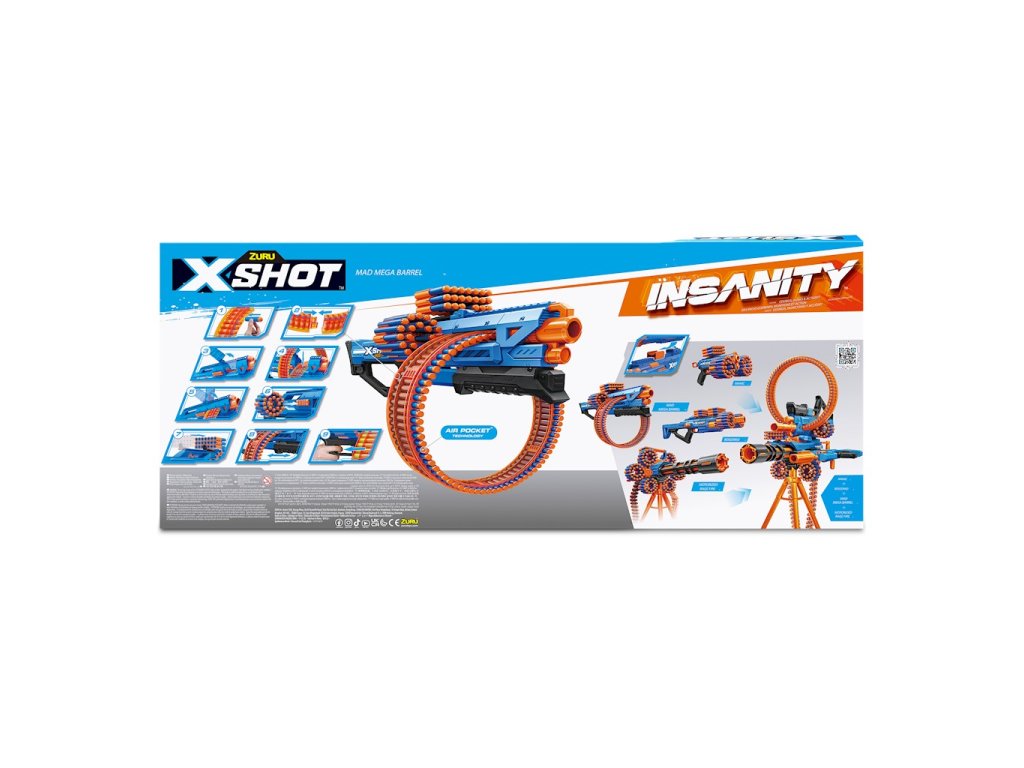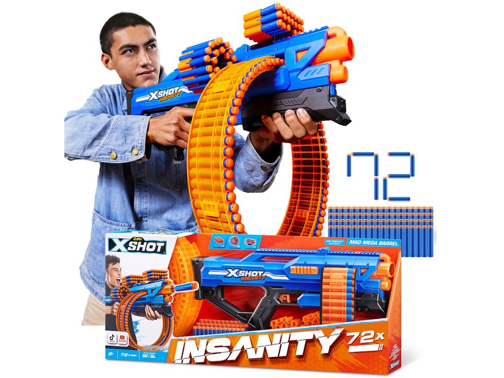 Společnost X-Shot od Zuru již několik let vyrábí odpalovací zařízení s ambicemi být lepší než konkurence. Nabízí řadu odpalovačů se skvělými vlastnostmi, a to jak z hlediska kvality provedení, tak z hlediska schopností. Pokud hledáte velmi dobrý launcher a za velmi dobrou cenu, pak jste na správném místě!X-Shot Insanity Mad Mega Barrel 36609