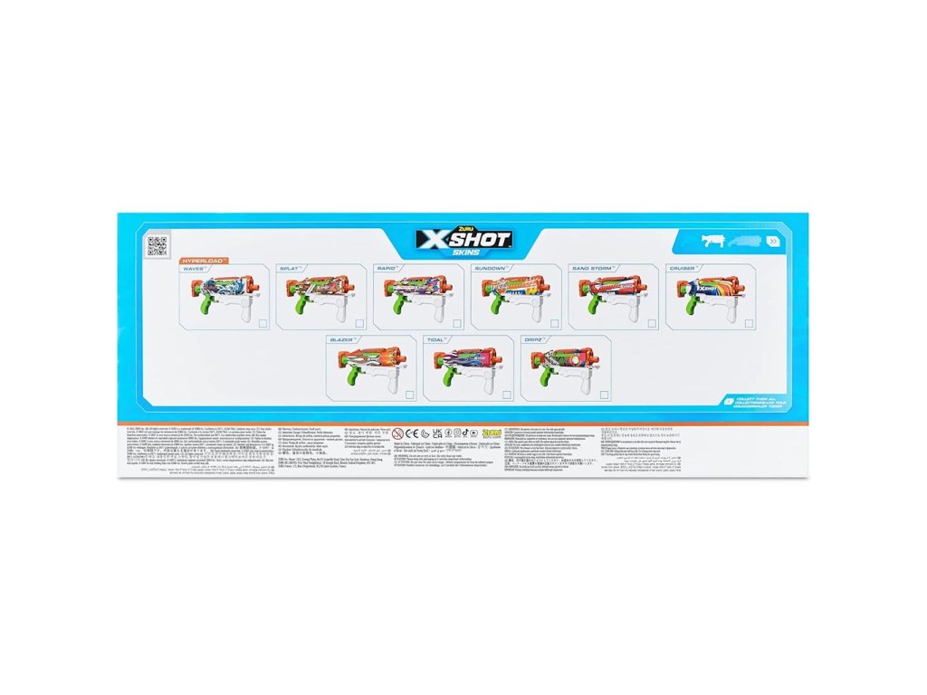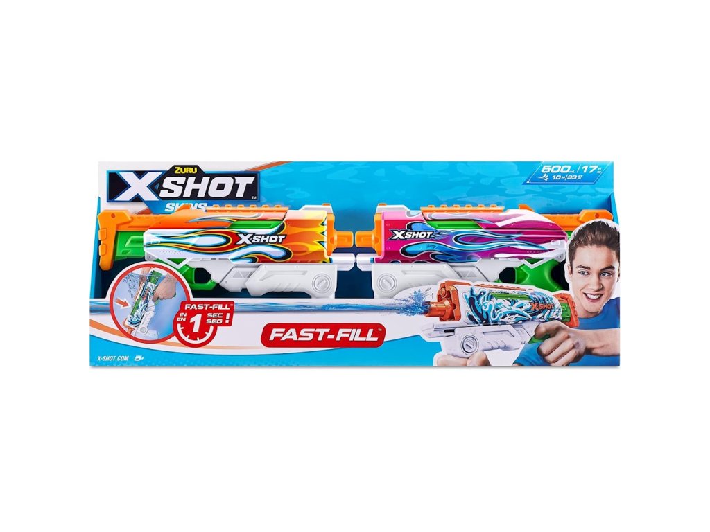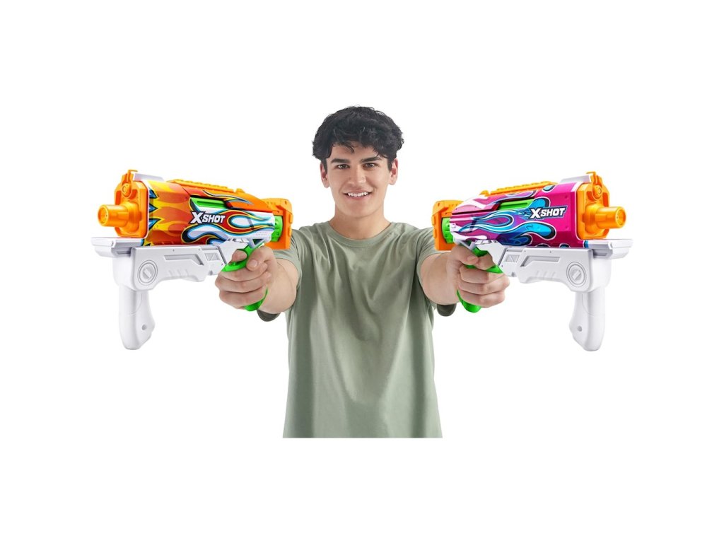 X-Shot Skins Fast-Fill 2-balení Hyperload 2 vodní pistole 11858Unikátní série X-Shot Skins Fast-Fill Hyperload! V této sadě najdete 2 vodní blastery Hyperload, které zaručí epické bitvy s přáteli. X-Shot Fast-Fill Hyperload jsou blastery, které naplníte vodou za pouhou 1 sekundu, takže se do hry vrátíte rychleji než vaši soupeři. Stačí ponořit, naplnit a zavřít – to vše díky technologii rychlého těsnění. Pistole vystřelí vodu až na 10 metrů a pojme 500 ml vody!