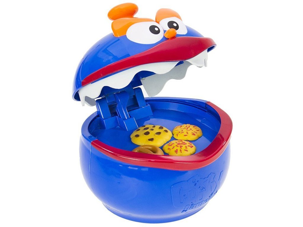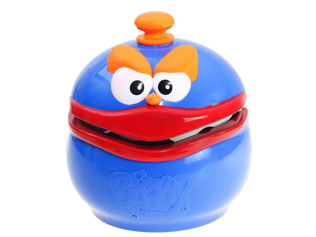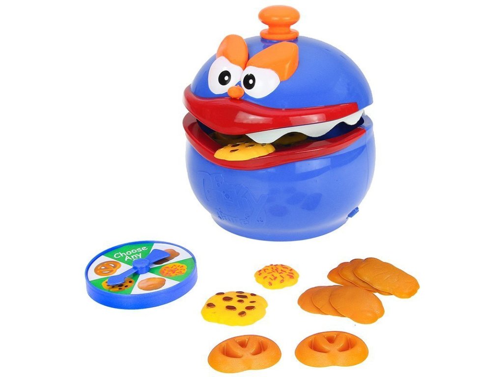 Vložili jsme Cookie Monster mezi hráče. Nainstalujte mu na hlavu knoflík. Pomocí rukojeti roztáhněte tlamu a posuňte zamykací tlačítko nahoru - čelist monstra bude znehybněna. V tuto chvíli můžeme klidně vhodit všechny sušenky. Uvolníme zámek a spustíme hru. Otočíme šipkou, šipka naznačí, jakou sušenku máme dostat z tlamy nestvůry. Při krádeži sušenky si pečlivě naplánujte každý svůj pohyb, jeden špatný pohyb a vaše prsty se lehce skřípnou. Můžeme hrát na tahy. Hra končí, když je jeden z hráčů uvězněn Cookie Monster. Hru vyhrává ten, kdo nasbíral více cookies. Hračka má zuby z měkké pěny. Když na něj cvaknete, dítěti to neublíží. Pozvěte své přátele a rodinu na fantastickou zábavu. Postavte se Cookie Monster, uvidíme, kdo bude chytřejší.