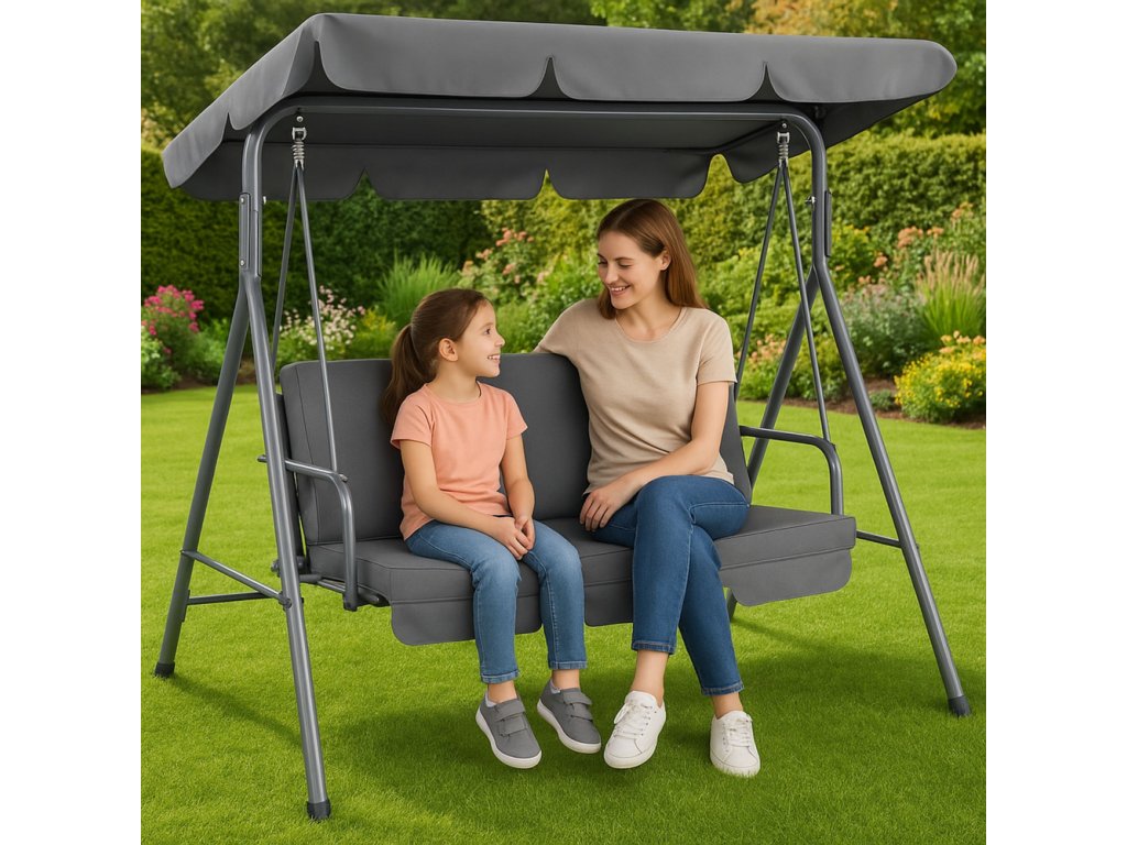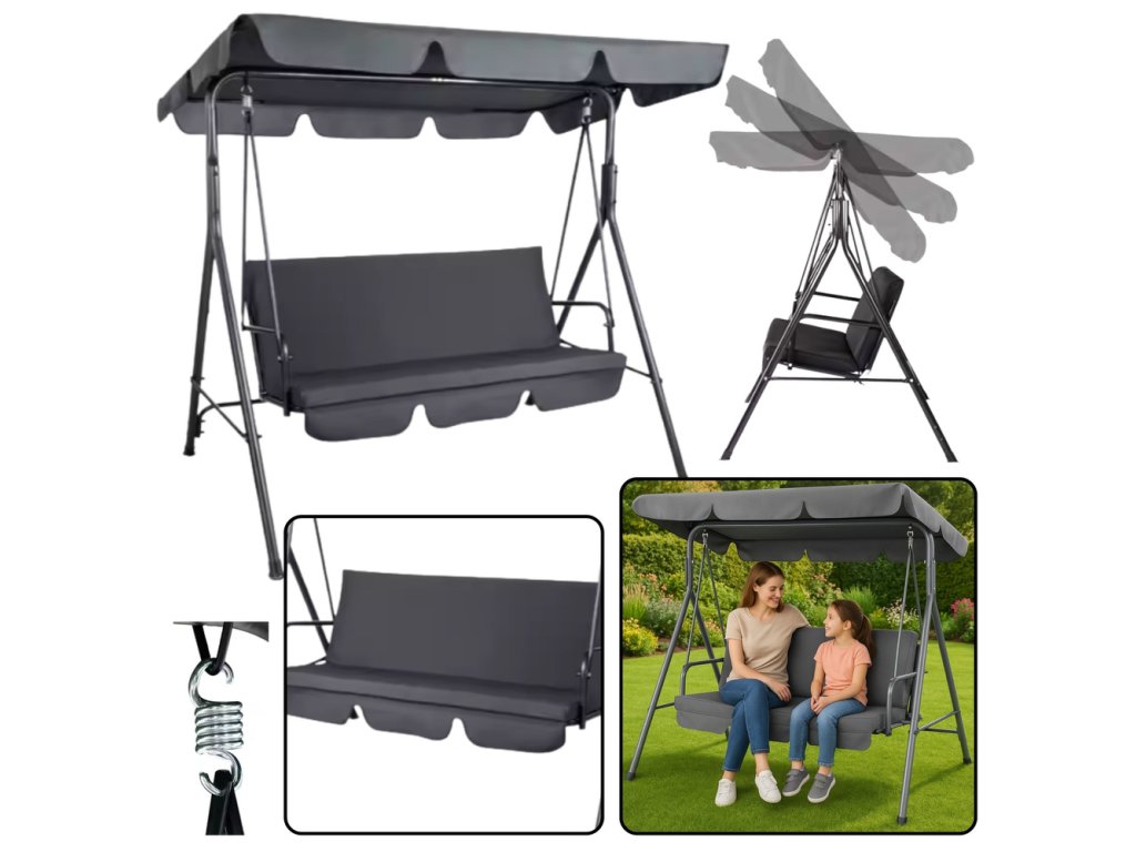 Styl, pohodlí a neopakovatelná relaxace - to vše najdete v zahradní houpačce, která kombinuje funkci klasického houpacího sedátka s pohodlím plnohodnotného lehátka. Pokud sníte o jedinečném místě k relaxaci venku, splní vaše očekávání v každém ohledu. Jeho ergonomický design umožňuje pohodlné sezení a volné ležení, díky čemuž je ideální pro každou situaci - od ranní kávy až po odpolední spánek ve stínu. Rám vyrobený z odolné oceli s práškovým nástřikem poskytuje dostatečnou stabilitu a odolnost vůči povětrnostním vlivům. Díky tomu je houpačka nejen odolná, ale také bezpečná pro každodenní použití. Měkká, tlustá matrace a dva polštáře v sadě nabízejí pohodlí, které očekáváte od prémiového nábytku – bez kompromisů. Stálá střecha nejen chrání před intenzivním sluncem, ale také doplňuje estetický vzhled celé konstrukce. Je to perfektní řešení jak pro domácí zahradu, altán, terasu nebo prostorný balkon. Díky velké užitné ploše pojme houpačka až tři osoby, díky čemuž je ideální pro rodiny nebo jako lehátko pro hosty. Funkce lehátka vám dává možnost volně relaxovat, aniž byste museli rozkládat další nábytek – stačí jeden pohyb a z klasické sedačky se stane pohodlný prostor pro ležení. Tato houpačka je víc než jen obyčejný kus zahradního nábytku - je pozvánkou ke každodenní relaxaci, kterou máte vždy po ruce. Vysoká kvalita zpracování, elegantní design a funkčnost dělají z houpačky ústřední bod vaší relaxační zóny. SPECIFIKACE: OBSAH SADY: