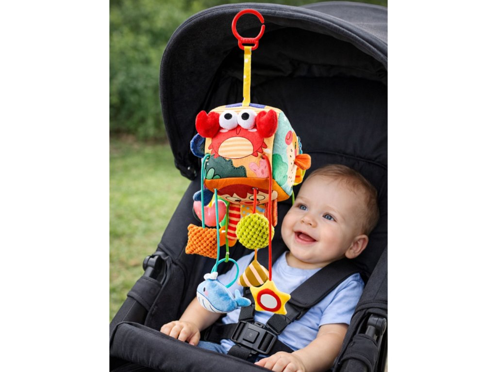 Kostka je vybavena praktickým přívěskem, který lze snadno připevnit na autosedačku, kočárek, lehátko nebo postýlku, takže hračka může dítě doprovázet jak doma, tak na cestách.