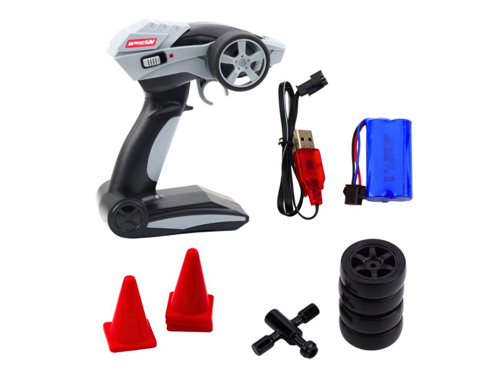 Model je vybaven systémem LED osvětlení - přední a zadní světla a neonové osvětlení podvozku - které dodávají realismus a styl. Ovládání probíhá pomocí dálkového ovladače 2,4 GHz, který zaručuje dosah až 25 metrů a bleskurychlou odezvu. Dodatečná sada pneumatik, servisní klíč a kužely vám umožní vytvořit si vlastní driftovou dráhu a trénovat manévry s plnou kontrolou.