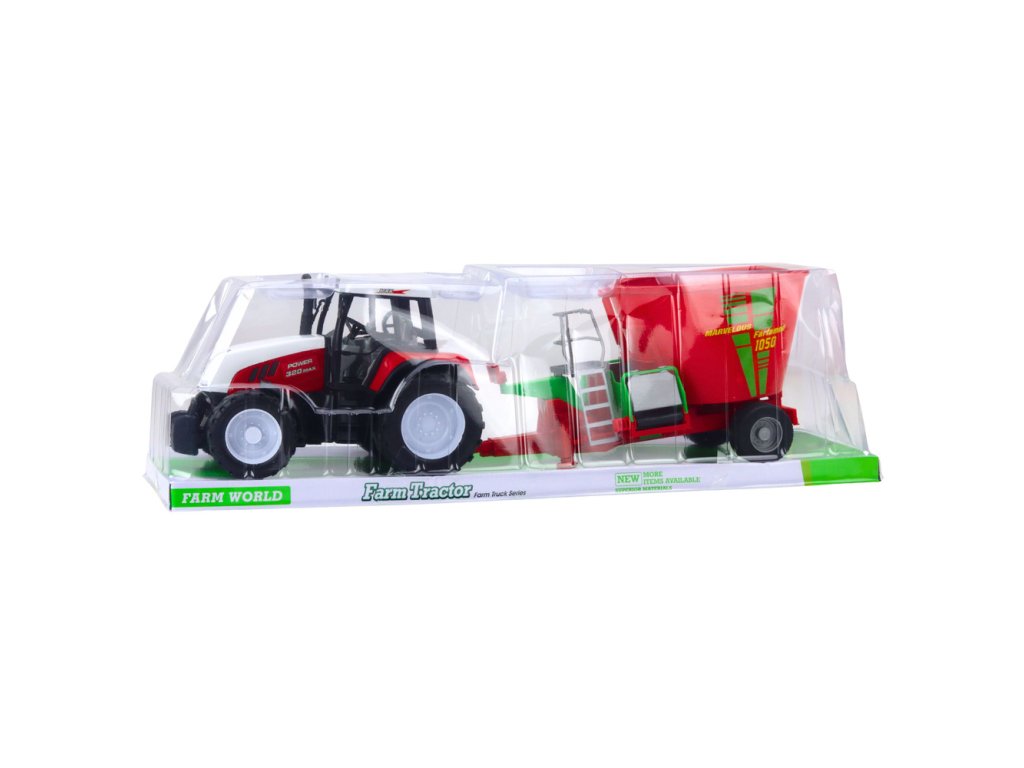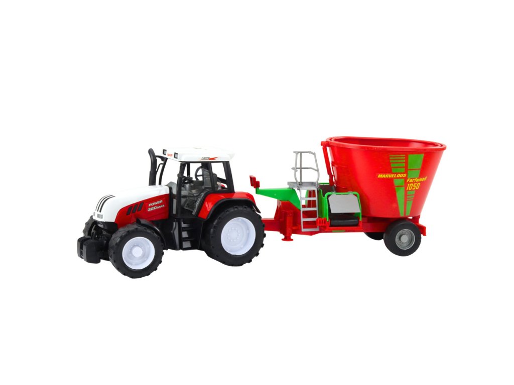 Traktor je vybaven pohonným systémem, který umožňuje vozidlu samostatný pohyb při jízdě vpřed. Přívěs s velkým červeným míchačem krmiva dodává realismus a umožňuje hraní scén ze života na farmě. Vyrobeno z odolných a pro děti bezpečných materiálů, zaručuje hodiny nápadité hry.