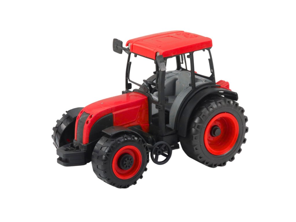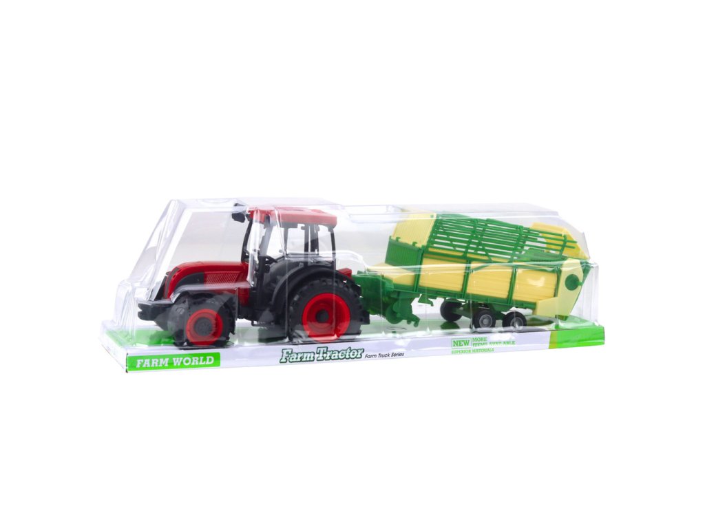 Zemědělský traktor s zeleným a žlutým přívěsem červený 50 cm