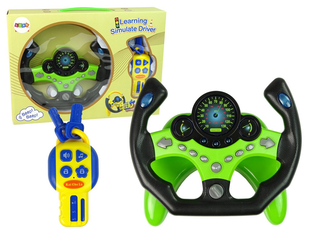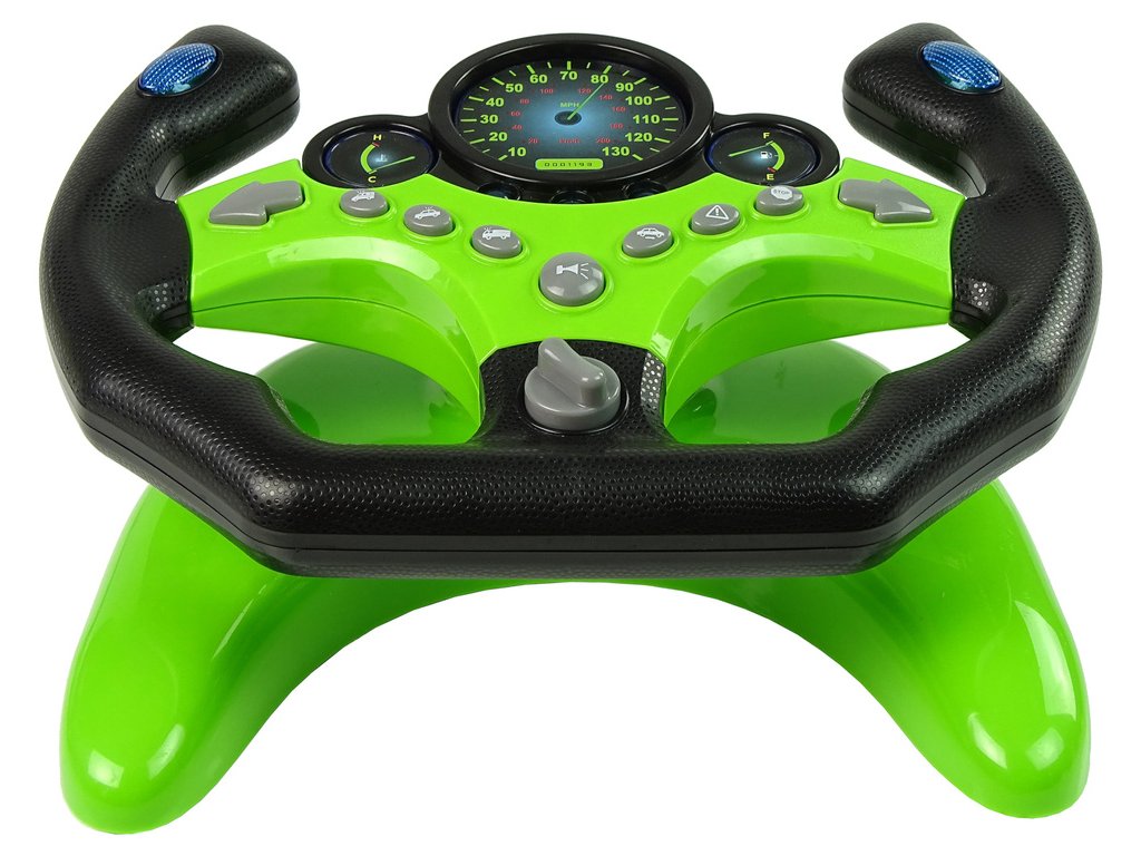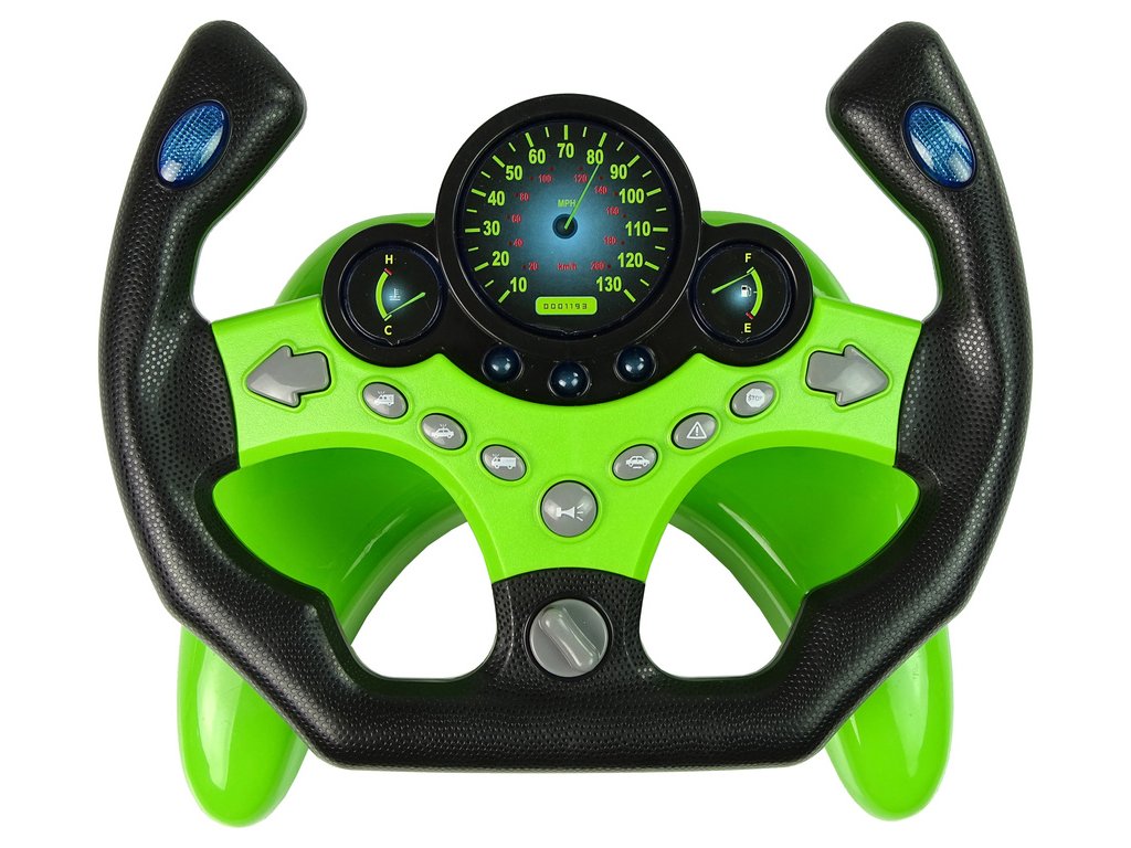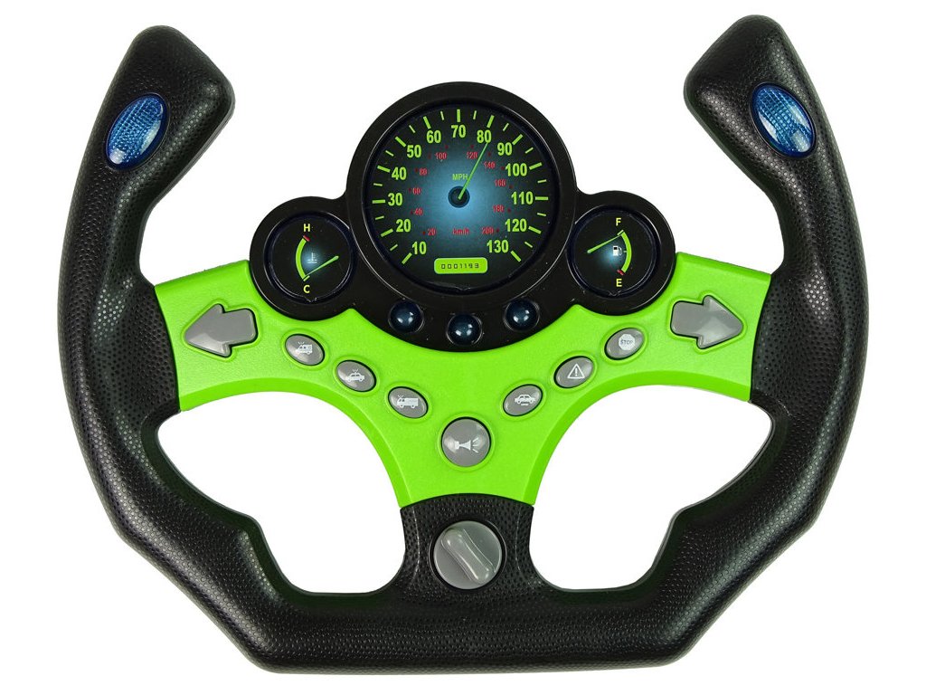 Volant je v barvě zelené a černé. Celý volant má 9 tlačítek včetně dvou ukazatelů, klaksonu a nouzových signálů. Stačí otočit startovacím klíčem a může začít hrát! Hodiny na volantu svítí modře. Díky vzhledu a LED diodám se vaše batole při řízení auta bude cítit jako na skutečné ulici. Volant skvěle padne do ruky vašeho batolete, stojan má přísavky, připevněte jej na stůl a užijte si zábavu! Je čas, aby vaše dítě simulovalo řízení.